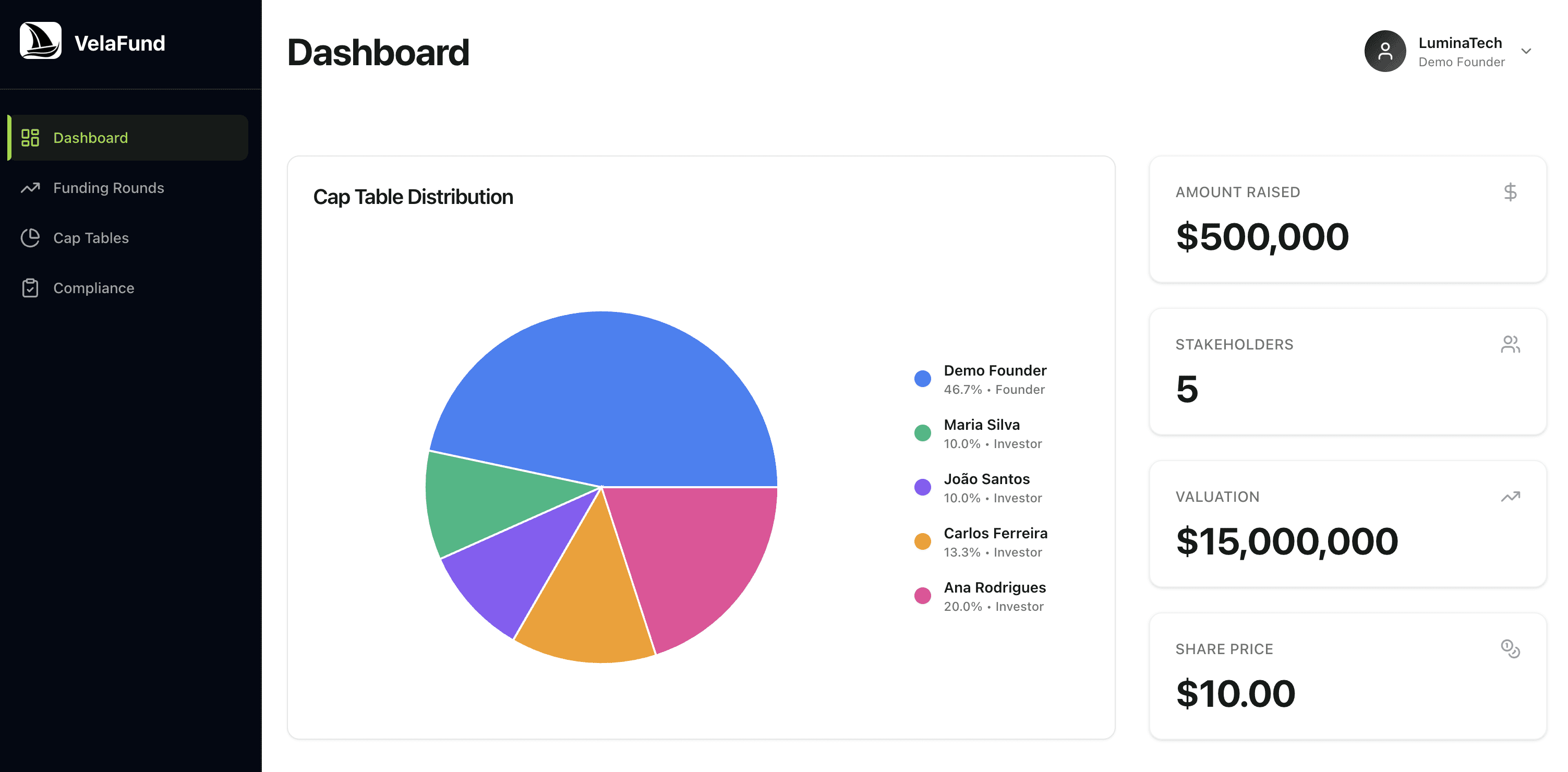 Ypur dashboard shows how much you've raised, cap tables and compliance documents so you can raise money fast while staying compliant.